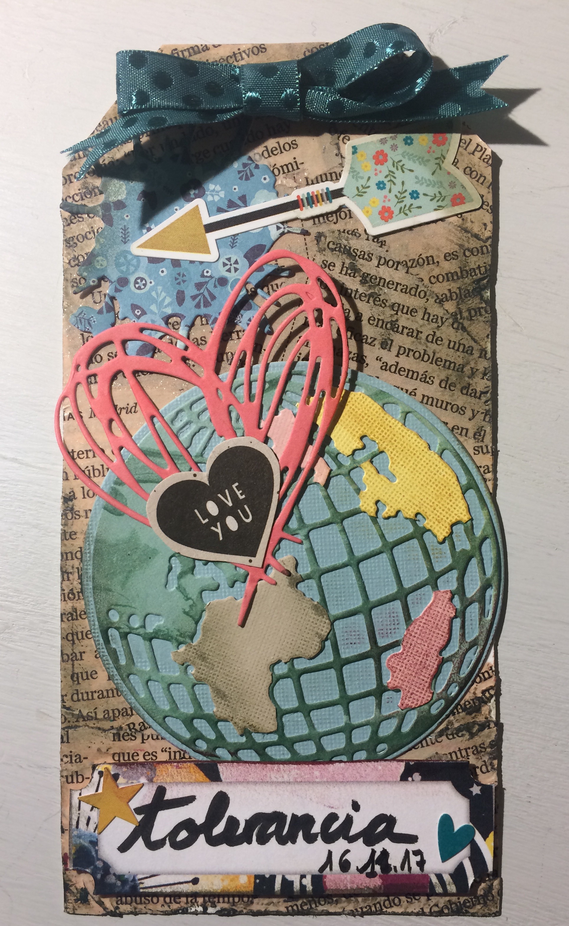 Se trata de una tag grandota, con una base de papel de periódico a modo de decoupache, troqueles molones y tintas distress.