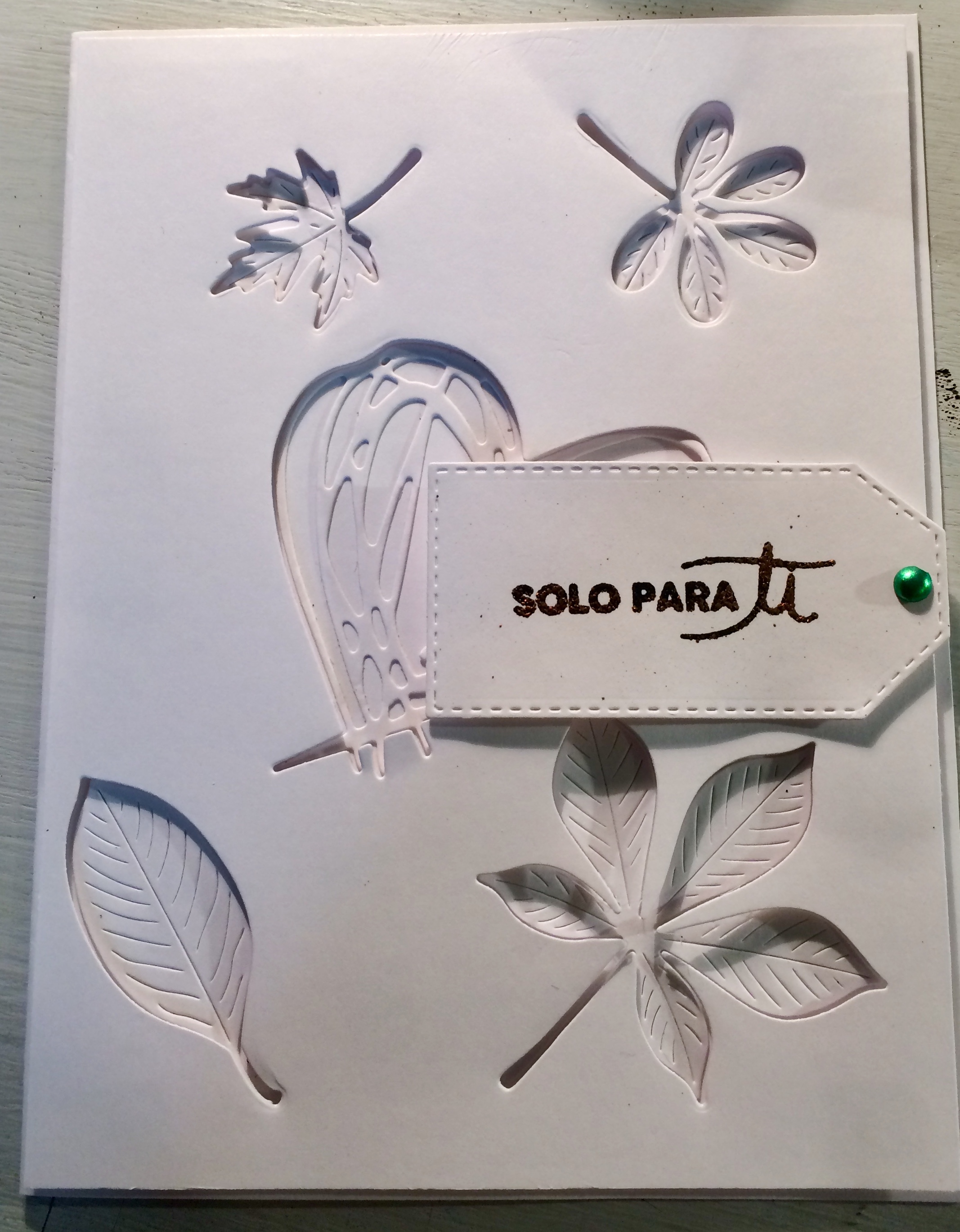 Pero también le he hecho un regalo a mi madre, siguiendo la tradición, uno manual, de estilo tarjeta…. y saliendo esta vez de lo que yo suelo hacer! Uno todo blanco! O casi todo blanco….Troqueles con volumen, y embossing en ocre, sobre tinta negraque no puede gustarme más ….