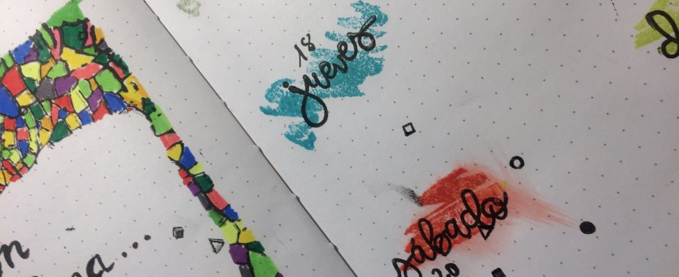 He usado un sello de craquelado pero como si fuera una vidriera, con muchos colores…. y un hueco en medio que he conseguido poniendo un papel que lo tapaba, rollo máscara. Además he usado esos sellos de manchurrones que tengo de fondo de semana y los que me encantan de los días de la semana de Lora Bailota!