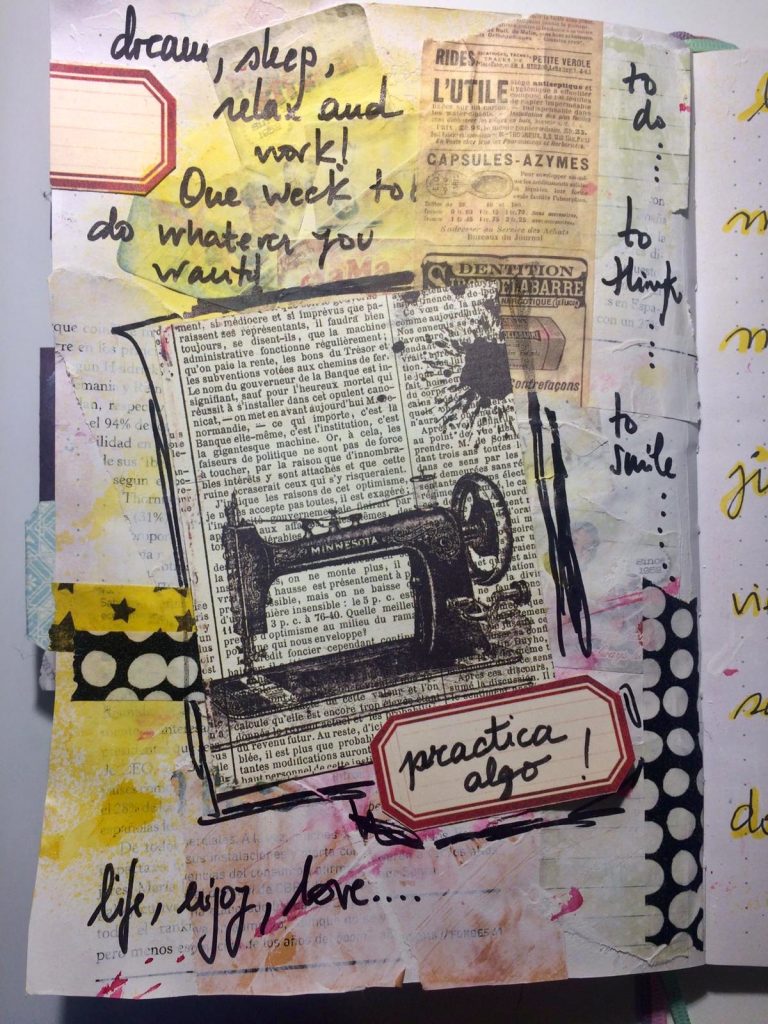 Tras lo oscuro de la semana anterior, he vuelto a los tonos aclarados con gesso, un montón de recortes de fondo, unas tintas con Luz amarillo y rosa y unos mensajes escritos! Práctica algo, lo que quieras, pero algo!