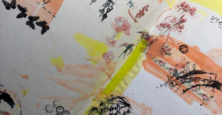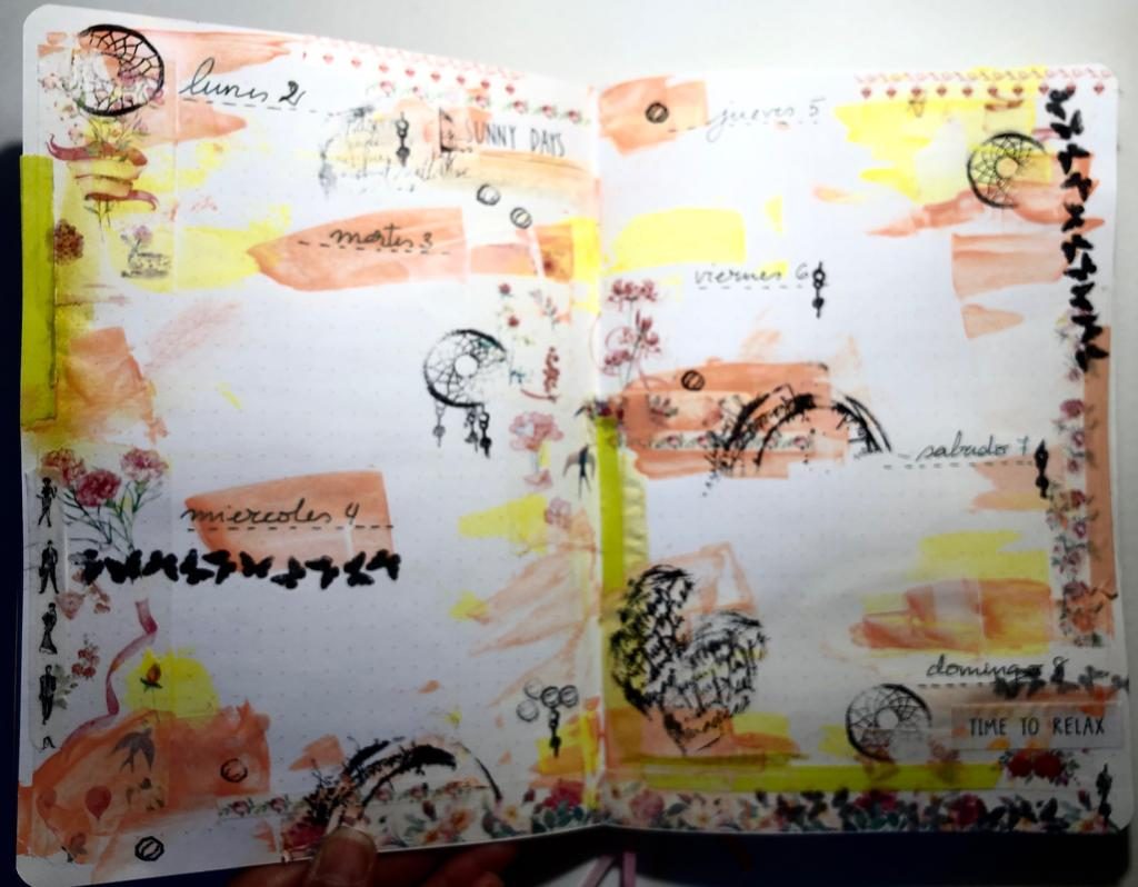 Pues eso, una base de washitape muy románticos y primaverales de flores, poco aptos para septiembre, y unas pinceladas de pinturas coral de amelie, blanca y amarilla junto con unos sellos de manchas y otros de mariposas son el conjunto de mi semana!