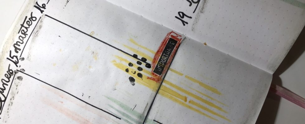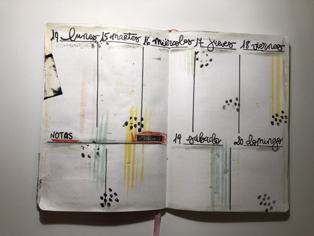 De cuando en cuando, me gusta volver a lo sencillo, a unas rotuladores y poco más… esta es una de esas semanas en las que he usado pocos materiales, sellos de semanas porque los tengo, un stencil, ceras acuarelables y no he sacado ni la regla por vaguearía, he usado la placa de metraquilato, que sirve para todo! 😅