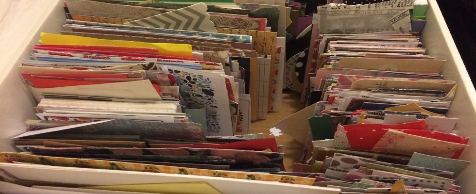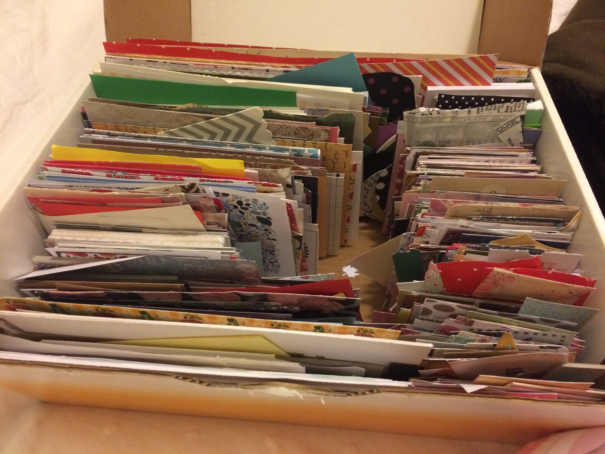 Desde entonces, no sé qué me pasa pero me siento poco creativa! Lo único que he ordenado son todas las sobras de papeles que voy generando de cada proyecto, que los he juntado por tamaños recirtandolo y dándole formas similares en una caja, a modo de tarjetas….. como para usar en project life….