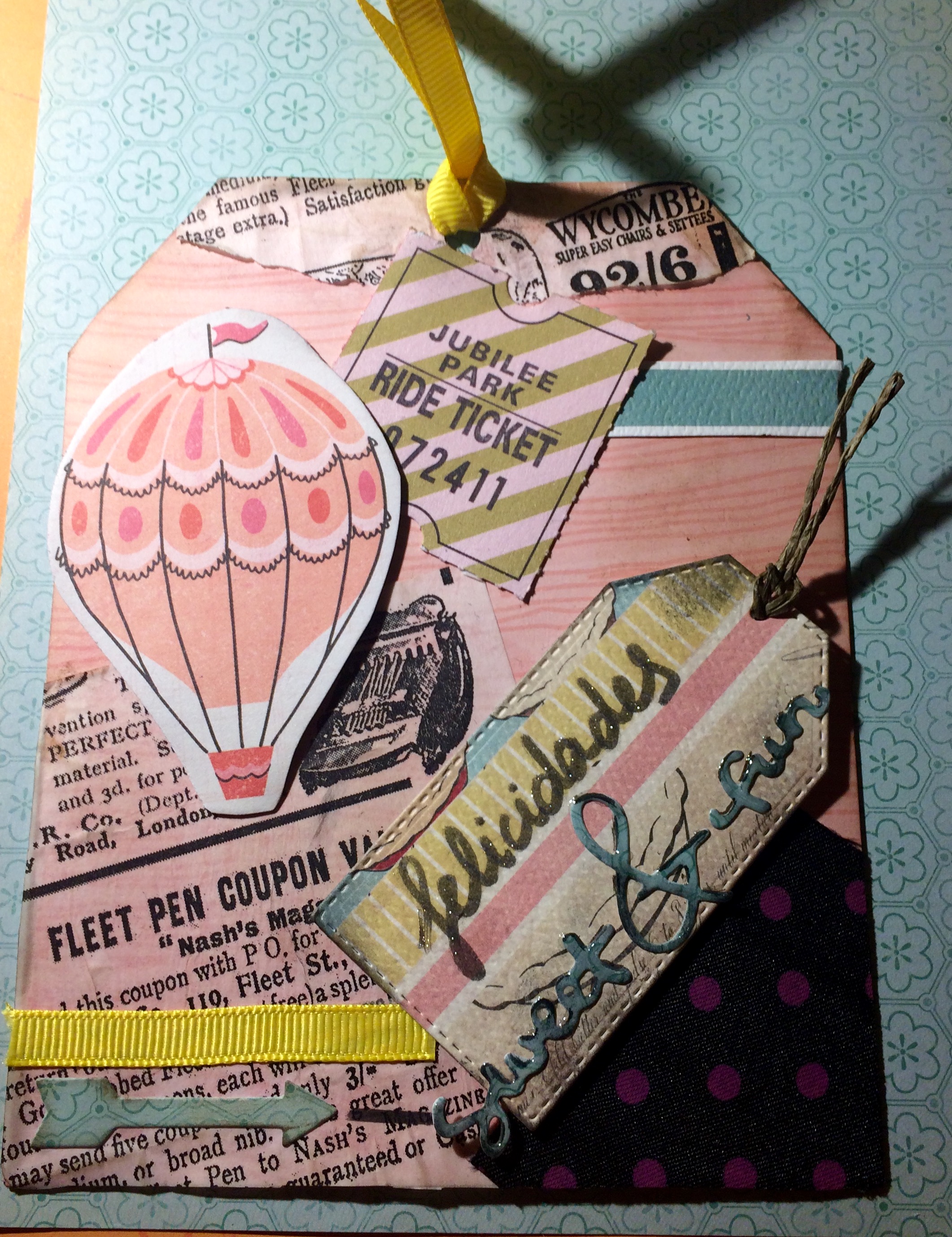 El fondo está hecho con papel sobre cartón y encima unos papeles tipo cebolla decorados que guardaba del verano (reciclados de un restaurante) pegado con ModPonge y tela adhesiva. Brillo en felicidades y glossy en las palabras troqueladas. Tinta distress sombreando y un poco de cariño!