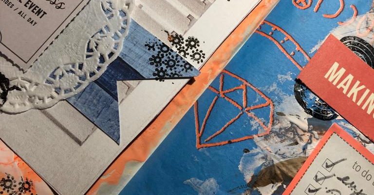 Pues un azul con naranja es difícil de combinar en scrap, al menos hay pocas colecciones que mezclen esos colores y en mixmedia aunque casi todo está permitido sigue siendo algo difícil!