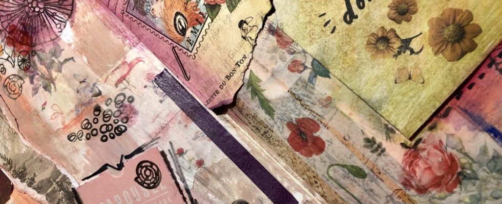 En vez de escoger de mi caja una sola cosa, elegí unos cuantos papeles que no tenían mucho que ver y pasé a preparar el fondo en rosados! Washitapes de flores, Sellos a trozos, pegar papeles y así es como inicialmente quedaba!