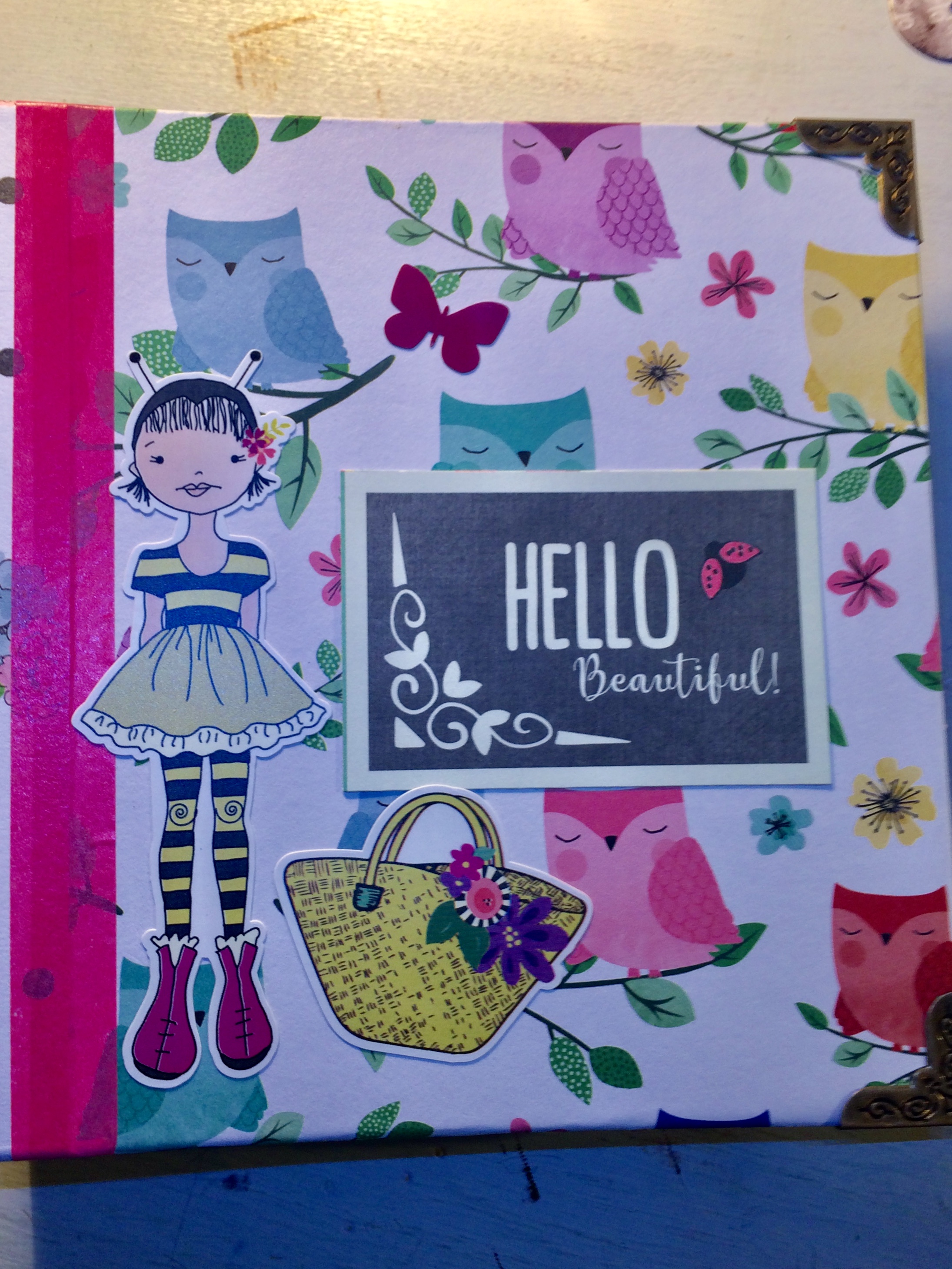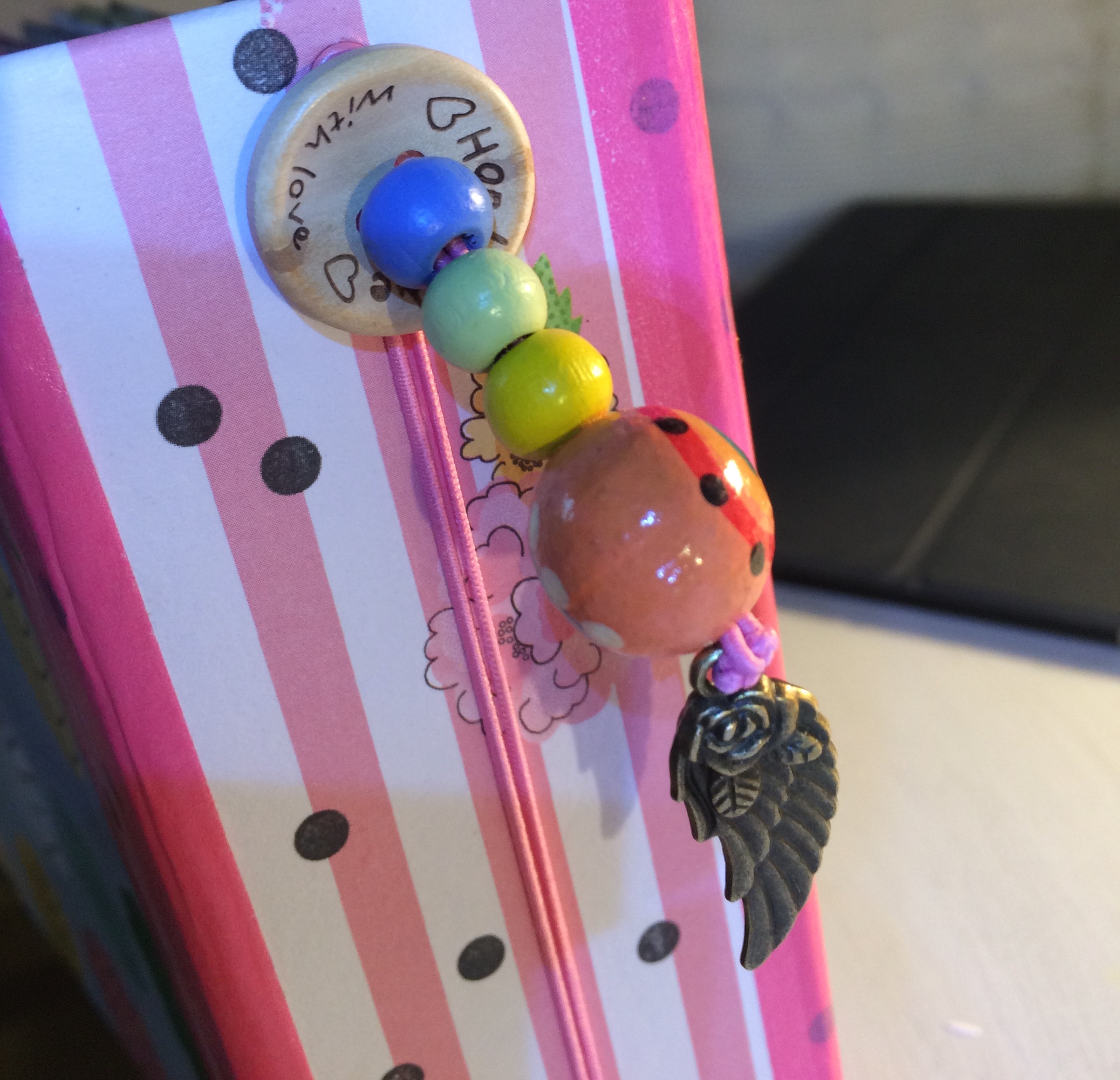 Encuadernación con gomas tipo midori, y de un tamaño pequeño, pero con muchos bolsillos para tags con fotos! Y mensajes de cariño.