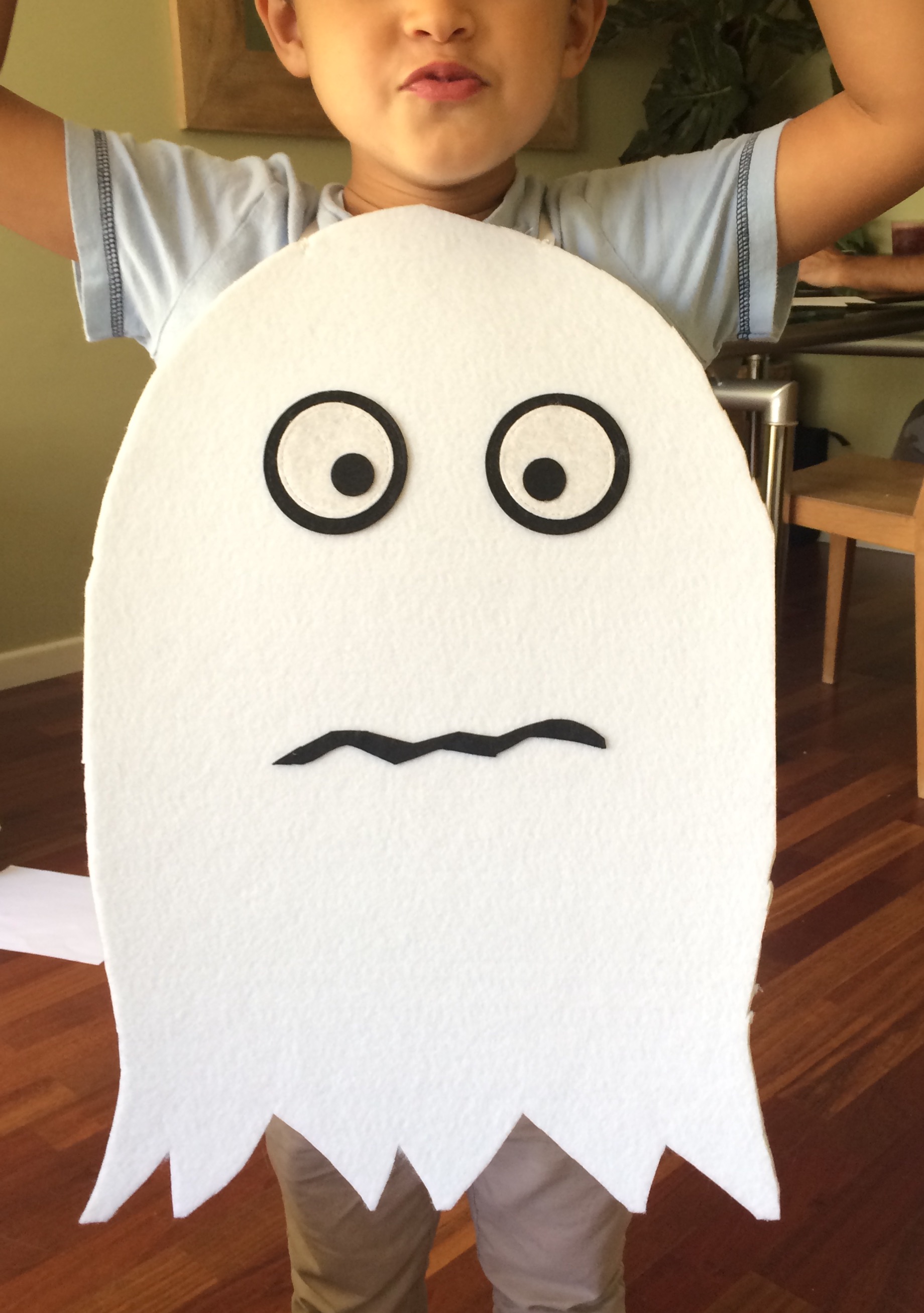 Facil, fácil! Dos planchas de fieltro blanco, con unos perales para ojos y boca unidos por gomas a la altura de lo a hombros! Y listo! En 10 minutos!!!!!