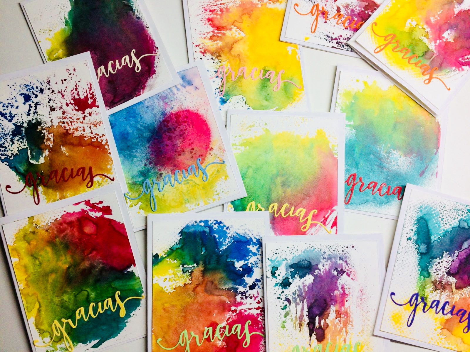 Papel de acuarela apoyado sobre tintas en spray mezcladas y un troquel de gracias sobre cartulinas de colores.