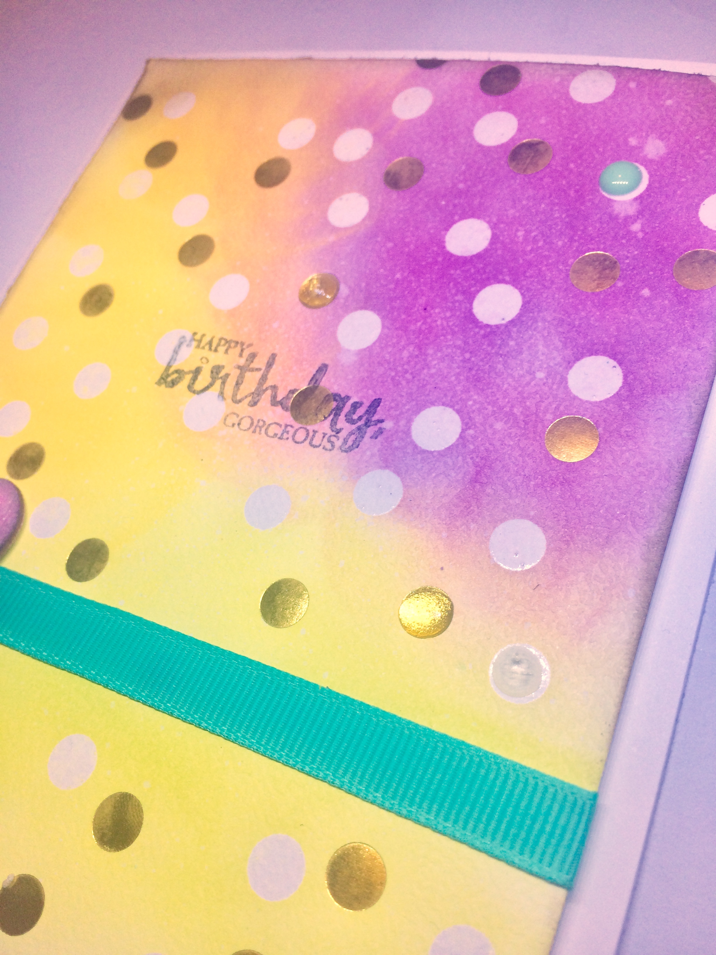 Con tres tonos de Distress Oxide, queda un fondo de lo más vistoso! Una cinta y una manzana de madera entintada y un sello de feliz cumple y glossy y Enamel dots es toda la decoración que lleva!