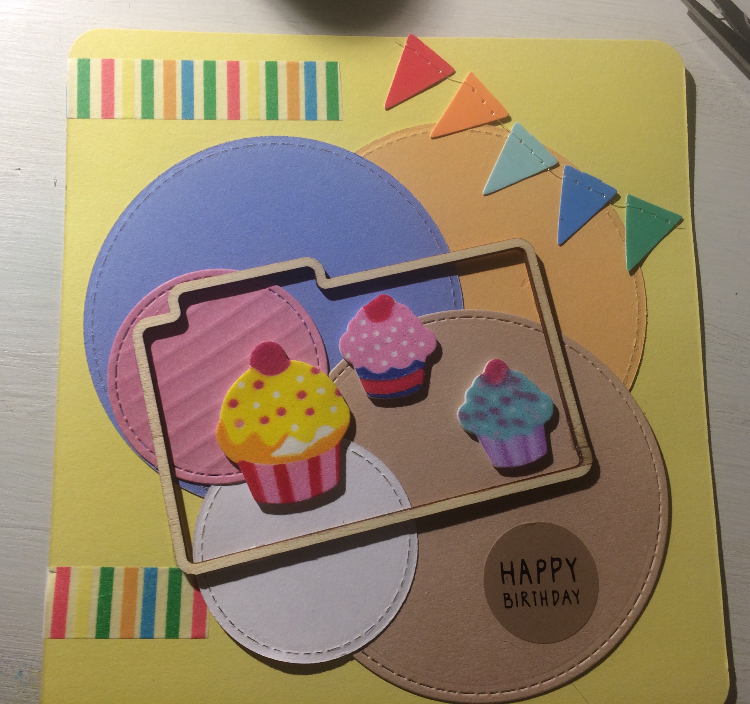 Unos círculos troquelados sobre una cartulina, a modo de marco, guirnalda de cumple, unas pegatinas de cupcakes y un marco de madera, simple y colorida!