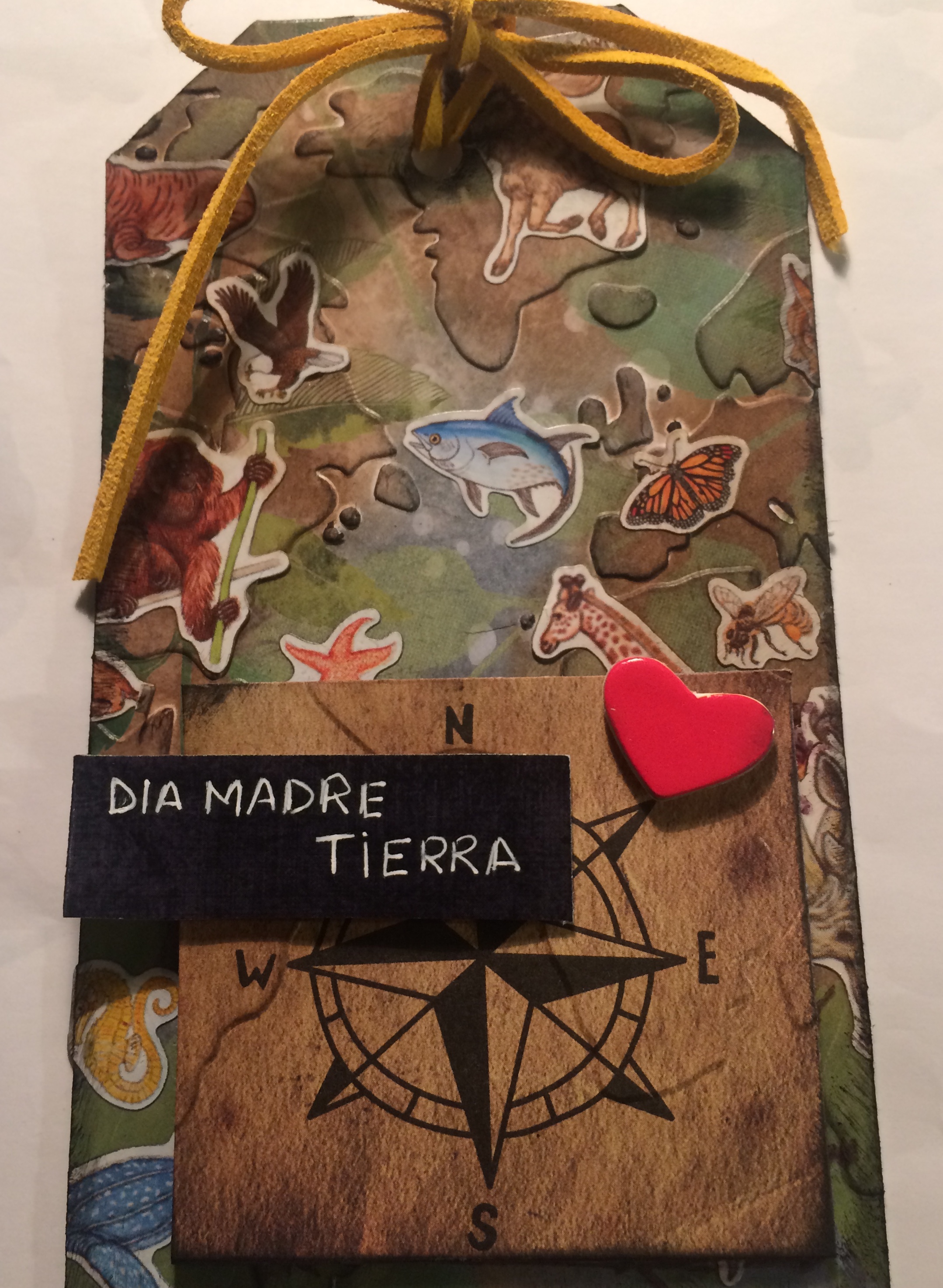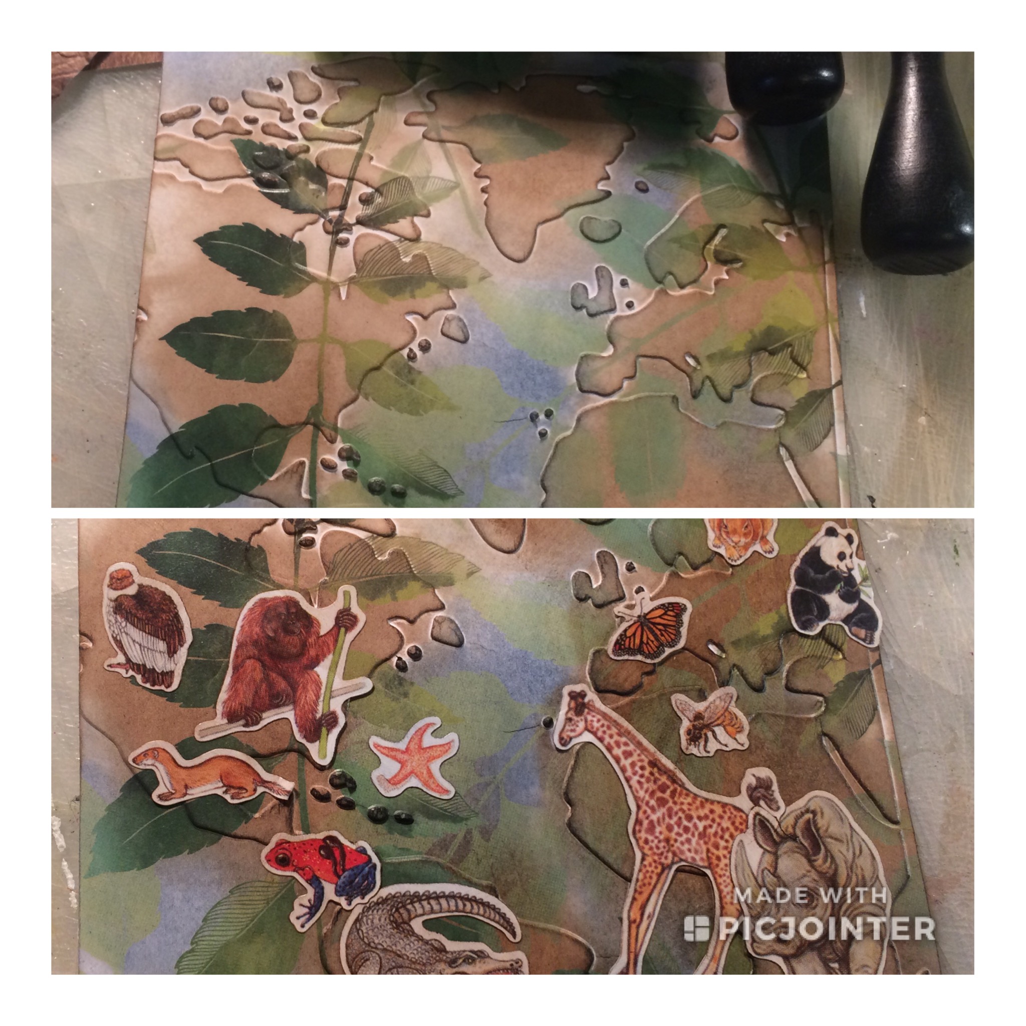 Sobre un papel con un dibujo de hojas, he hecho un embossing en frío de un mapa del mundo, y tintado con tintas distress. He puesto unas pegatinas de los niños de animales.