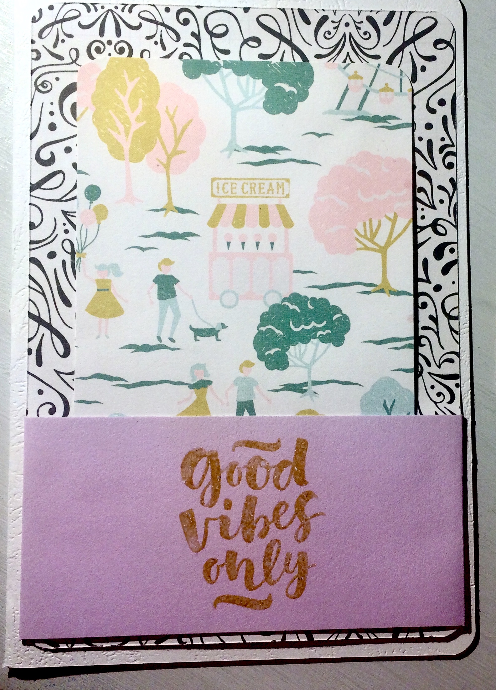 Se ha puesto muy de moda esto de “Good Vibes”, y es que da muy buen rollo, perfecto para un vuernes! Yo me he hecho con un sello y en esta tarjeta va en embossing caliente en dorado que no se aprecia  bien en la foto.