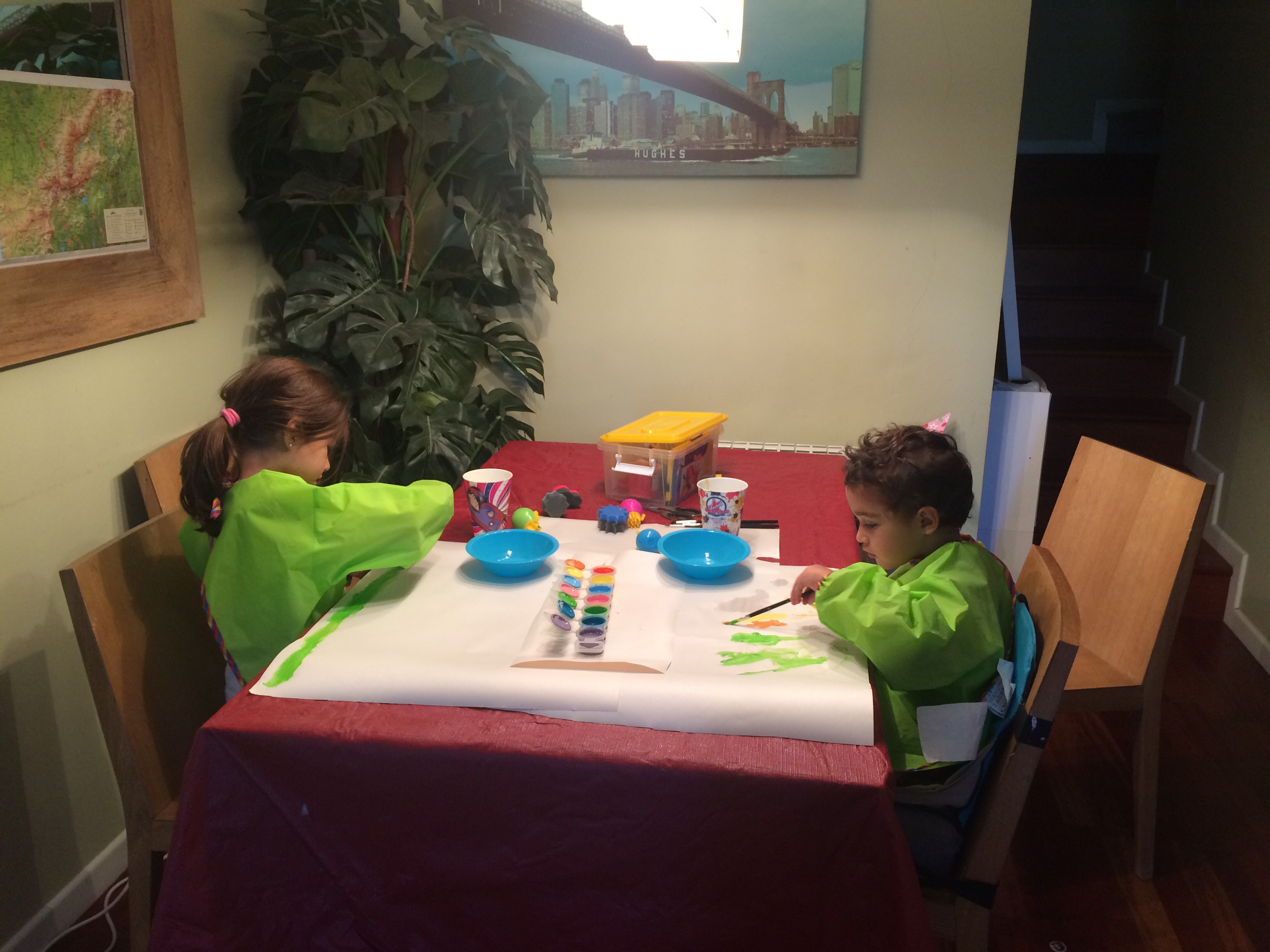 Cuando los niños amanecen temprano, la comida no requiere preparación, la casa está medianamente ordenada y no tienes más que esperar a que te abran el supermercado (el domingo, sí, ya sabemos que hay libertad de horarios comerciales)….. qué se te ocurre para mantener a los niños entretenidos?…. nosotros pintamos, con pincel!!!!!
