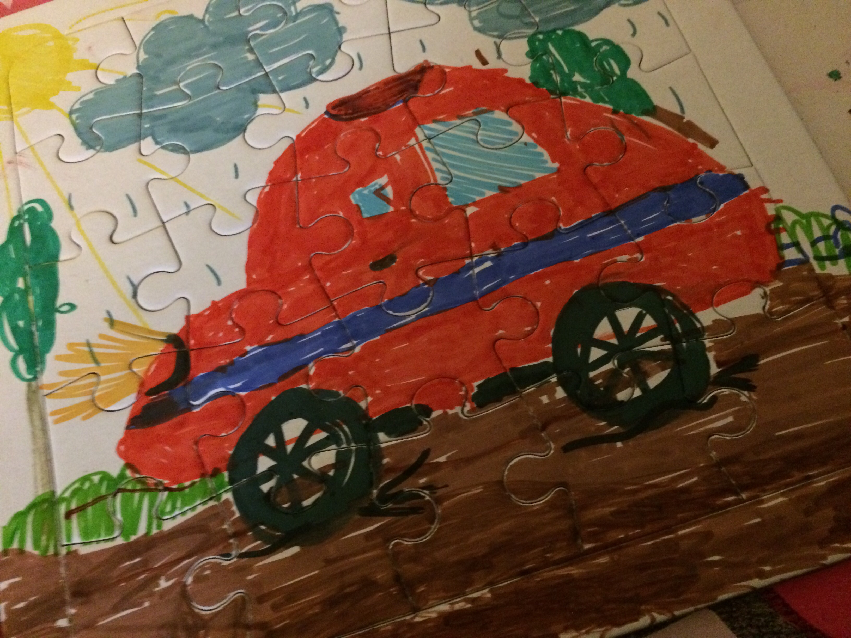 Pues tenía un par guardados y hoy los he sacado, y la verdad, escarmentada, mis instrucciones han sido más precisas! Directamente a Gonzalo le he pintado la silueta de un coche y él ha entendido que tenía que colorear….. carlota no sabía por qué tenía también que extender el dibujo a los bordes del puzzle pero explicándole que eso servía como guía para el resto del dibujo, parece que lo ha entendido!