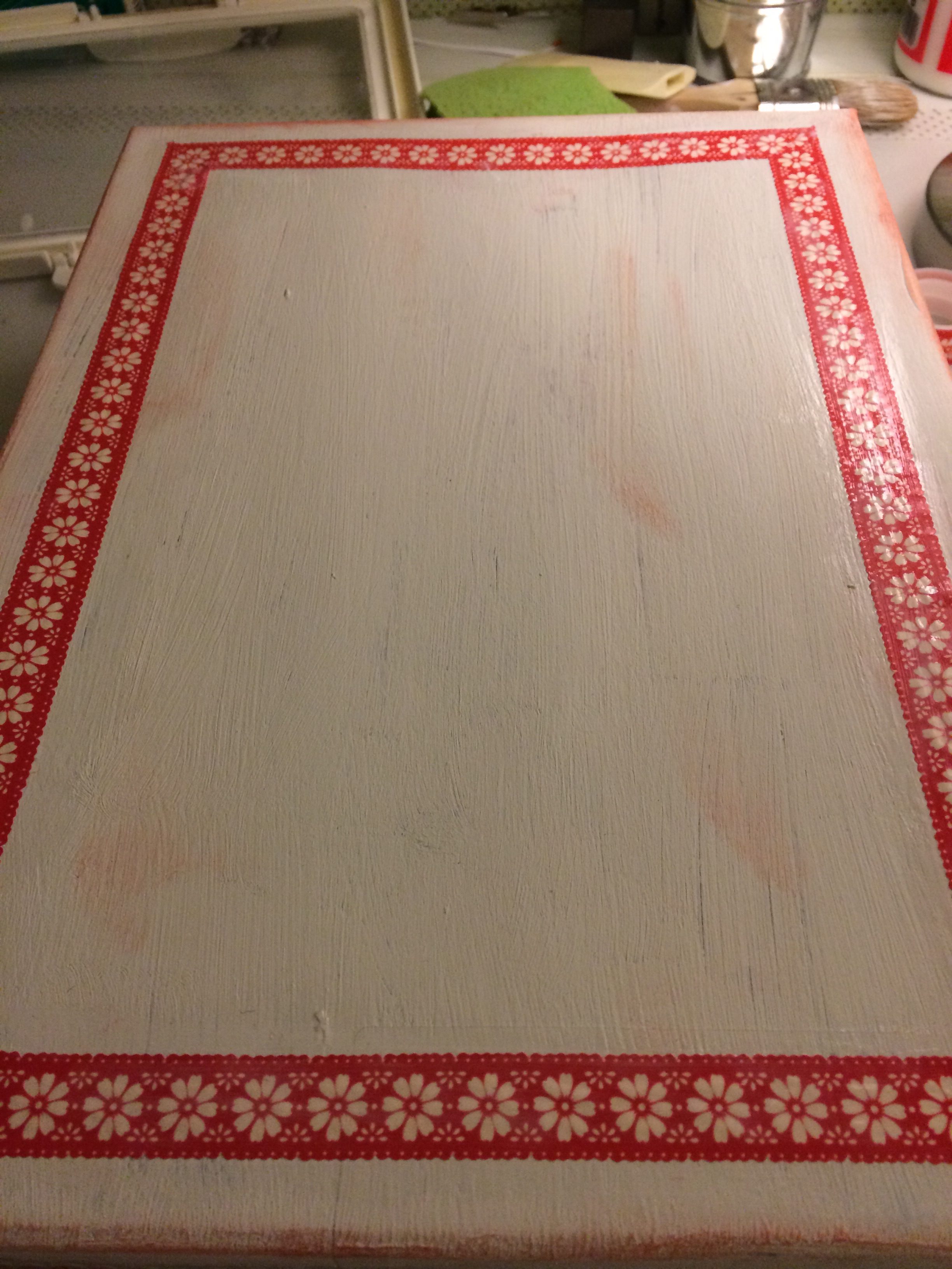 Para fijar bien el washitape sobre la pintura he puesto un pegamento de decoupache que «lo pega todo», pero le dio un poco de brillo porque éste no era mate. En ocasiones posteriores lo que he hecho es en vez de ese pegamento, dar un barniz de ceras manley y queda estupendo! Mejor que este resultado aunque también aporta brillo!