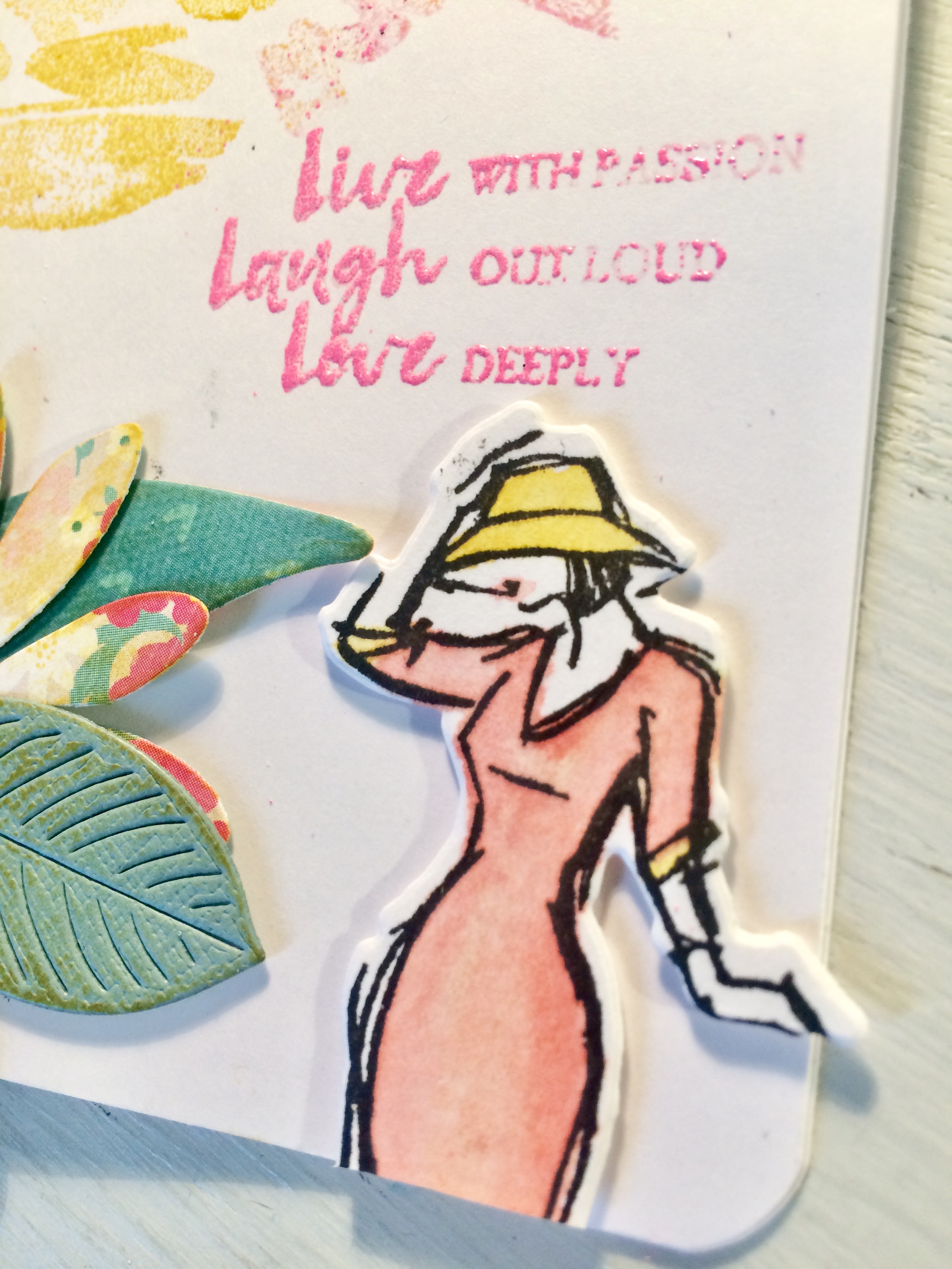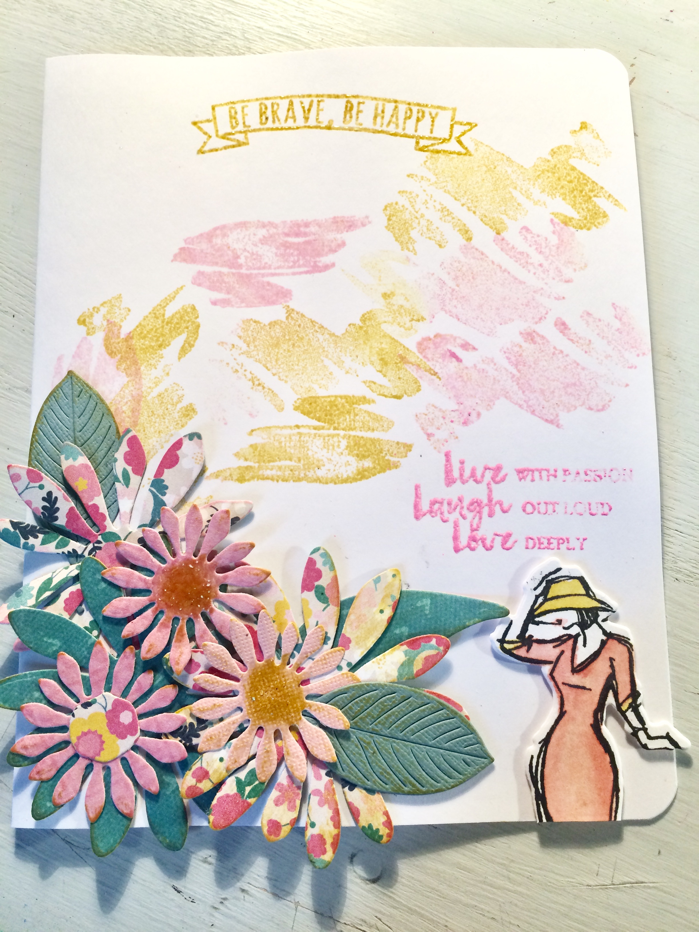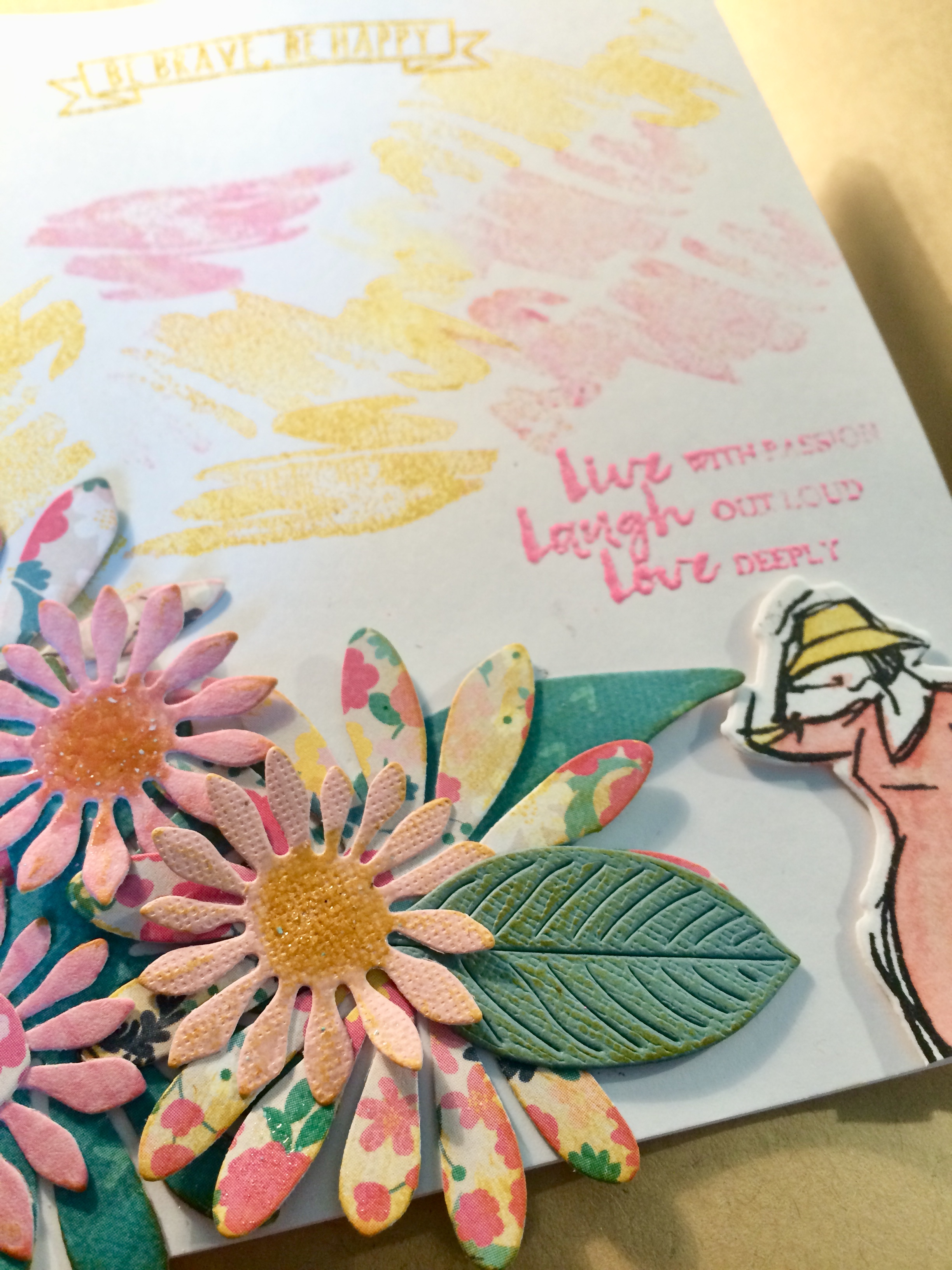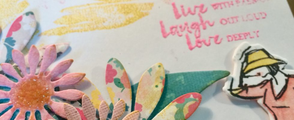 Queria probar hacer cosas con flores, que la verdad, me cuesta y estoy poniendo empeño, además el embossing en esos tonos con letras siempre es difícil. Con las mismas tintas y pincel de agua, he pintado ese sello que me han regalado! Manchurrones con sello…. y ha quedado de lo más primaveral!