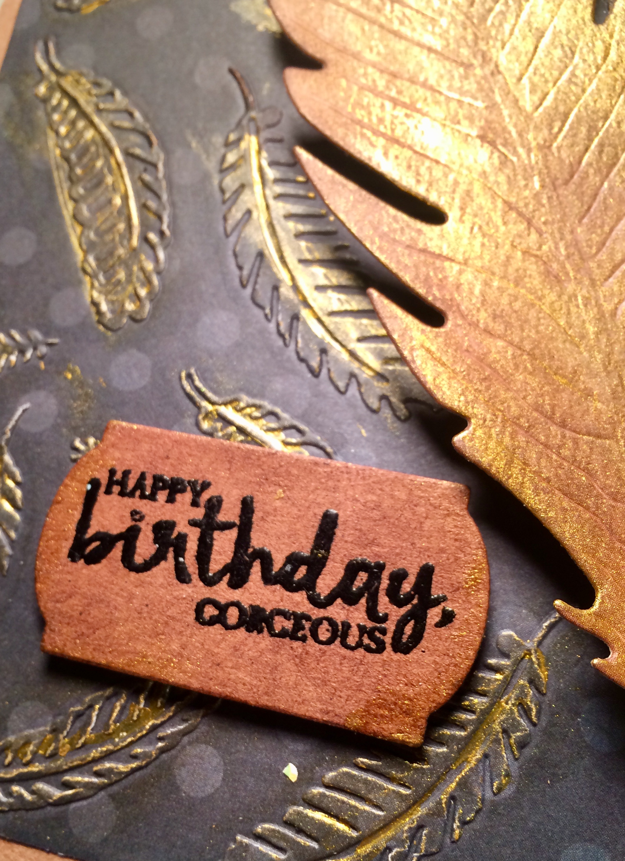 Pues sobre un papel de lunares en negro y gris, y un embossing en frío de plunas, he dado un pigmento dorado, así, con el dedo, guarreando. Luego en un papel con textura y tonos en marrones, he troquelado una gran pluma. Le he dado un par de tintas distress en varios tonos y luego, más pigmento dorado.