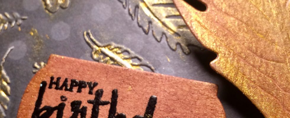 Un sello con embossing en caliente con mensaje de cumpleaños sobre cartulina Kraft y más tintas y más pigmento! Para finalizar, fondo kraft y volumen.